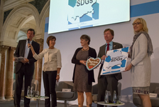 Am 28. September 2015 veröffentlichte das Eine Welt Netzwerk Bayern e.V. sogenannte "Bayerische SDGs" (Sustainable Development Goals oder nachhaltige Entwicklungsziele). In Anlehnung an die von der internationalen Staatengemeinschaft am 25.-27.9.2015 in New York beschlossenen internationalen SDGs, haben bayerische Eine Welt-Gruppen seit April 2015 an der Formulierung der "Bayerischen SDGs" gearbeitet. Die "Bayerischen SDGs" wurden am 28.9.2015 an Staatsministerin Dr. Beate Merk, der bayerischen "Eine Welt-Ministerin" übergeben. (Fotos: Eine Welt Netzwerk Bayern e.V. / I. Wittenzellner / B. Schurse)