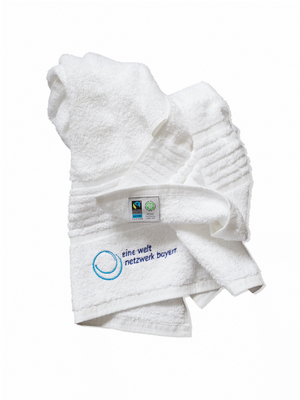 Das abgebildete Handtuch ist aus Bio-Baumwolle, in Hotelqualität, GOTS- und Fairtrade-zertifiziert. Das Eine Welt Netzwerk Bayern macht damit zusätzlich auf das Themenfeld nachhaltige Beschaffung aufmerksam.