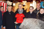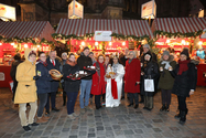 Die Siegerstände erfüllten nicht nur am besten die Fragebogen-Kritierien, sondern passen auch perfekt in die Weihnachtsromantik: in der Kategorie Kunsthandwerk/Spielwaren der Schutzengelstand (Nr 131) und in der Kategorie Süßwaren Bio Lebkuchen G. Müller (Nr. 102). Auf dem Foto die Sieger mit dem Christkind.