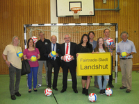 Im Zuge ihres Aktionsprogramms „Landshut spielt fair“ hat die Arbeitsgruppe „Landshut gegen ausbeuterische Kinderarbeit“ in Kooperation mit der Stadt Landshut und mit Unterstützung der Sparkasse weitere faire Bälle auf den Weg gebracht: Es gibt nun Trainings- und Turnierfußbälle, Handbälle und Volleybälle aus dem fairen Handel mit dem Landshuter Stadtwappen und der Aufschrift: „Landshut spielt fair“. Das Bild zeigt Oberbürgermeister Hans Rampf (Vierter von Links) bei der Übergabe der neuen Bälle an die Landshuter Schulen. Eine Welt-Promotorin Kirstin Wolf unterstützt dieses Projekt von Anfang an.