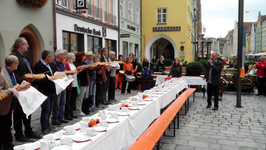 Anlässlich seines 30jährigen Bestehens und zum Abschluss der fairen Woche 2015 baute der Landshuter AK Partnerschaft mit der 3. Welt e.V. am 25.9.2015 eine 25 Meter lange Kaffeetafel vor dem Rathaus auf. Ziel war es, alle BürgerInnen und die Landshuter Politik-VertreterInnen zu einem fair gehandelten Kaffee einzuladen und auf die Notwenigkeit des Fairen Handels aufmerksam zu machen. Die BäckerInnen-Azubis der Landshuter Berufsschule stifteten einen 12 Meter langen Hefezopf mit fair hergestellten Zutaten, der allen sehr gut schmeckte. Das Ganze wurde sowohl mit initiiert wie auch organisatorisch unterstützt von Eine Welt-Promotorin Kirstin Wolf sowie vom Landshuter Runden Tisch gegen ausbeuterische Kinderarbeit und der Stadt Landshut. Foto: Kurt Büttler (Vorstand des Landshuter AKs) begrüßt die Gäste und eröffnet die Tafel, an der sich den ganzen Nachmittag zahlreiche BesucherInnen einfanden und es sich schmecken ließen.